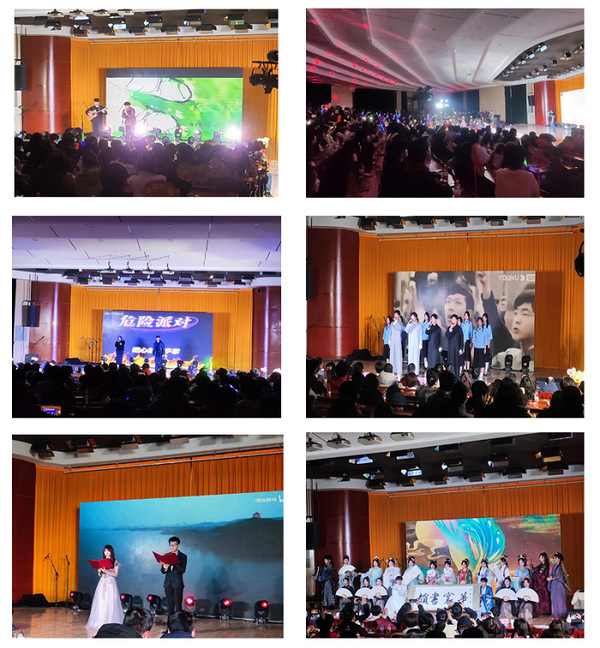 晚会在尹佳霖同学带来的唢呐独奏《好运来》中拉开帷幕,《模特走秀》展现最新时尚潮流,为我们带来一场视觉盛宴;《失恋阵线联盟》、《舞蹈串烧》、《霹雳舞》、《集体舞》等舞蹈节目融合了动感的节拍与欢快的音乐,激情澎湃、活力四射、点燃全场;汉服秀《汉服之美,书法之韵》、中阮独奏《龙灯》为大家带来汉服与古乐器的视听盛宴,仿佛回到了那个遥远而又充满古韵的年代;歌曲《斑马斑马》、《房间》、《危险派对》、《莫等》赢得了观众们的阵阵掌声和欢呼声;情景剧《砥砺前行》让我们重温百余年前一群先进青年在爱国主义运动高声的呐喊,唤醒当时沉睡的中国,让我们更应当铭记五四精神,传承五四精神;小品《时间去哪儿了》让我们在笑声中意识到,很多时候我们应该放下手机去做更多有意义的事情;最后,晚会在诗朗诵《我爱你,中国!》中落下帷幕。