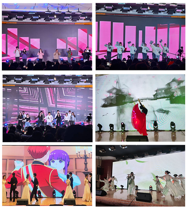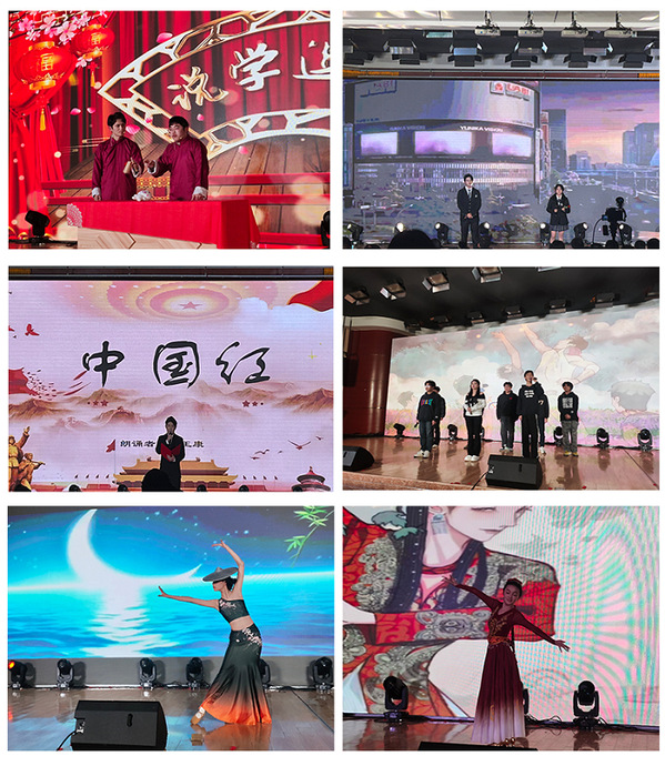 紧接着,各类精彩节目纷至沓来,令人目不暇接。歌曲《王妃》与舞蹈《街舞男孩+这就是街舞》,燃爆全场,拉开晚会序幕;模特走秀、舞蹈串烧则以炫酷的服装和时尚动感的步伐,掀起了一场璀璨夺目的风暴,展现了青春的时尚与个性;小品《反诈联盟》以幽默风趣的方式揭示骗局,向同学们传递反诈防骗的知识;歌曲《年少有为》、《等你下课》满载着对青春的怀念、对遗憾的释怀,以及对未来的期许;相声《说学逗唱》,演员们身着长衫,以幽默诙谐的语言、扎实的基本功,为大家带来了一场场精彩绝伦的相声表演;舞蹈《爱的华尔兹》舞者们彼此相依,步伐协调,诠释了青春的自信与激情,展现了当代大学生积极向上的精神面貌;歌曲《爱人错过+你要跳舞吗》活力四射,独特的旋律和歌词传递出青春的活力,将晚会推向高潮;舞曲《采茶纪》展现了竹笛演奏与舞蹈的完美融合,随着舞蹈演员的走动,一幅山间采茶图就这样跃然于眼前。朗诵《中国红》+《青春正当时》展现对时代的深情礼赞,激发青年学子勇立潮头、为家国担当的壮志,奏响时代奋进强音最后,晚会在民族舞《洛春踏雪》中圆满落幕,寄托了浓厚的情感和对新的一年的美好祝福。