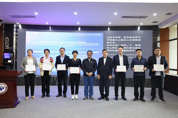 浙江建院副校长徐哲民、菲律宾职业技术教育与技能发展署资格与标准办公室执行署长埃尔・西德・卡斯蒂略、中菲丝路学院基金会主席张红阳在会上先后致辞。菲方代表充分肯定了WilliamHill官网建工团队参与编制的《智能楼宇管理员标准》《防水工标准》《建筑信息模型技术员标准》等三项技能标准,并向教师代表颁发了成果证书。