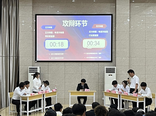 从预赛到决赛,参赛辩手们就“职业打假应不应该被鼓励”、“我应该当一个合群的人还是不合群的人”、“电信诈骗是预防更重要还是打击更重要”等辩题展开了激烈讨论。正方辩手逻辑清晰,论据充分,阐述观点时掷地有声;反方辩手也毫不示弱,言辞犀利,以独特的视角进行反驳,不断挖掘辩题深度。在辩论过程中,双方你来我往,从多个层面剖析辩题。无论是开篇立论的沉稳大气,还是自由辩论环节的唇枪舌战,都展现出了同学们敏捷的思维和出色的口才,辩手们的精彩表现不时赢得台下观摩同学的阵阵掌声与喝彩。