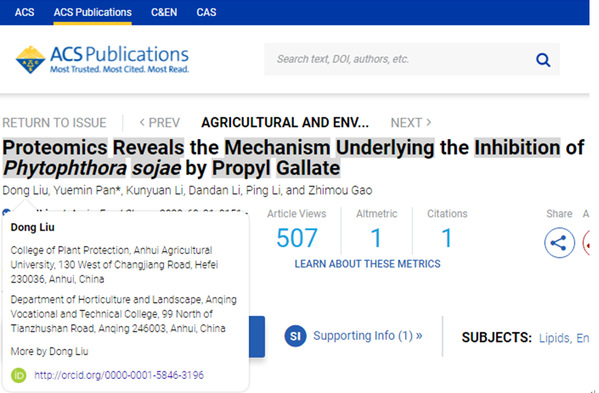 继我院刘冬老师在Journal of Agricultural and Food Chemistry发表题为Proteomics Reveals the Mechanism Underlying the Inhibition of Phytophthora sojae by Propyl Gallate研究成果后;刘老师受邀担任该杂志的审稿人,并审阅稿件两篇(1.Response of Saccharomyces cerevisiae to nerol: evaluationof antifungal potential by proteomic and metabolomicAnalyses;2.Benzoxazines in the root exudates mediate nonhost disease resistance of maize to Phytophthora sojae ante-infection)。审稿工作获得杂志社认可和肯定。