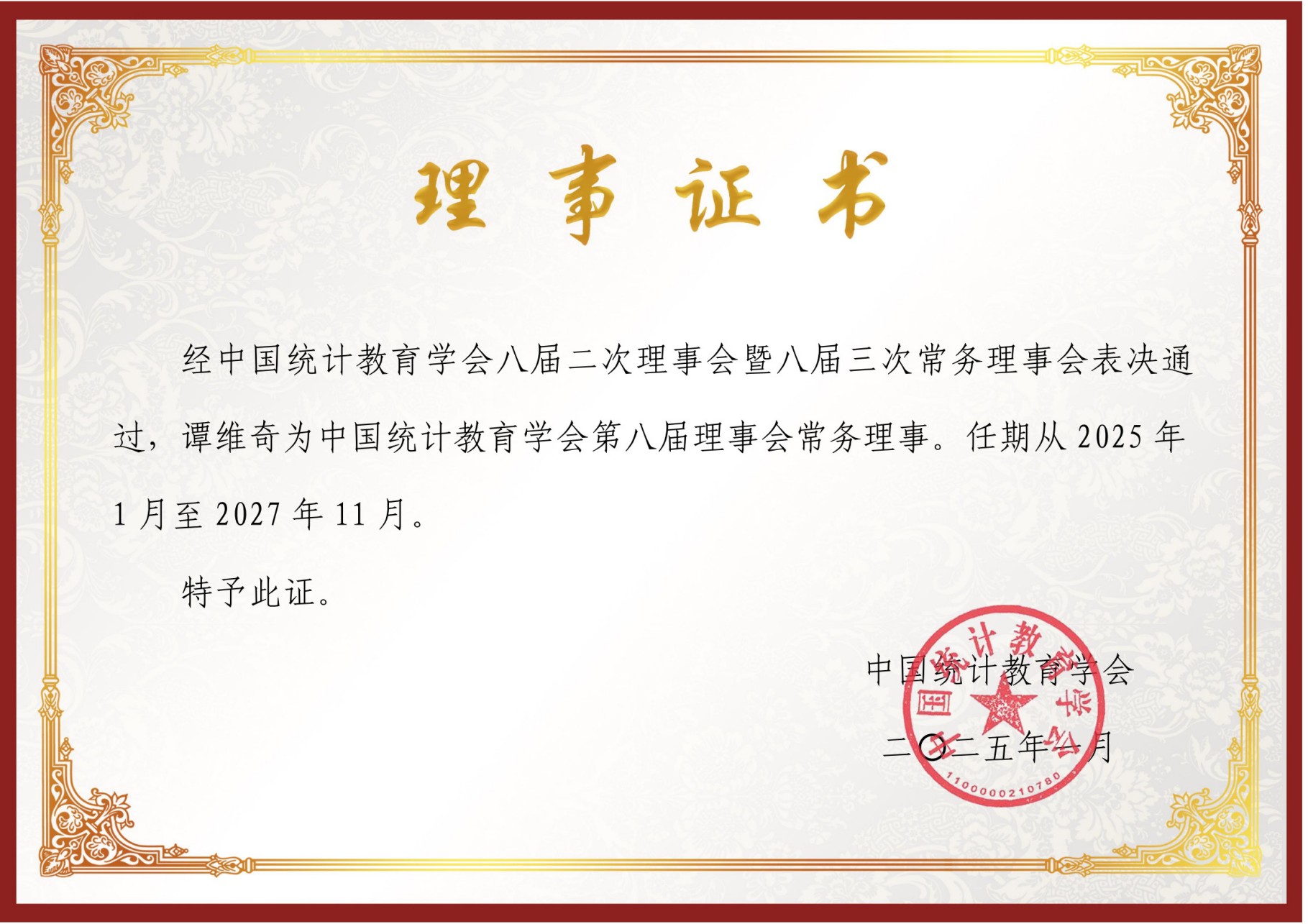 谭维奇教授现为中国统计教育学会职业教育分会副会长、国家教育部统计职业教育教学指导委员会委员、国家教育部职业教育基本专家库成员,多次担任国家级奖项评委。此次当选为中国统计教育学会第八届理事会常务理事,不仅是对他个人学术水平和领导能力的肯定,也有助于加强职业教育分会与中国统计教育学会本部及其他分会之间的联系与合作,促进资源共享和经验交流,共同推动中国统计教育事业的繁荣与发展。