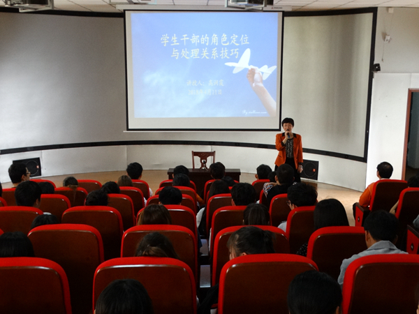 高润霞首先分享了自己学习生涯中的学生干部经历,用亲身体会向大家介绍学生干部工作对自我成长的帮助。然后,她分别从学生干部的角色定位、学生干部关系处理技巧和学生干部应具备的工作态度等三大方面对全体学生干部进行了深入浅出的讲解和引导,解读了大学生干部的两重涵义:为(wéi)学生做干部和为(wèi)学生做干部。她指出,学生干部首先必须是一名合格的学生,作为学校和学生之间的桥梁和纽带,除了要具备强健的体魄、健康的心理、良好的学习成绩和突出的交往能力外,还应具备服务、奉献、创新、楷模、团结、仁爱意识,应本着全心全意为同学服务的宗旨,做好上情下达、下情上报的工作。