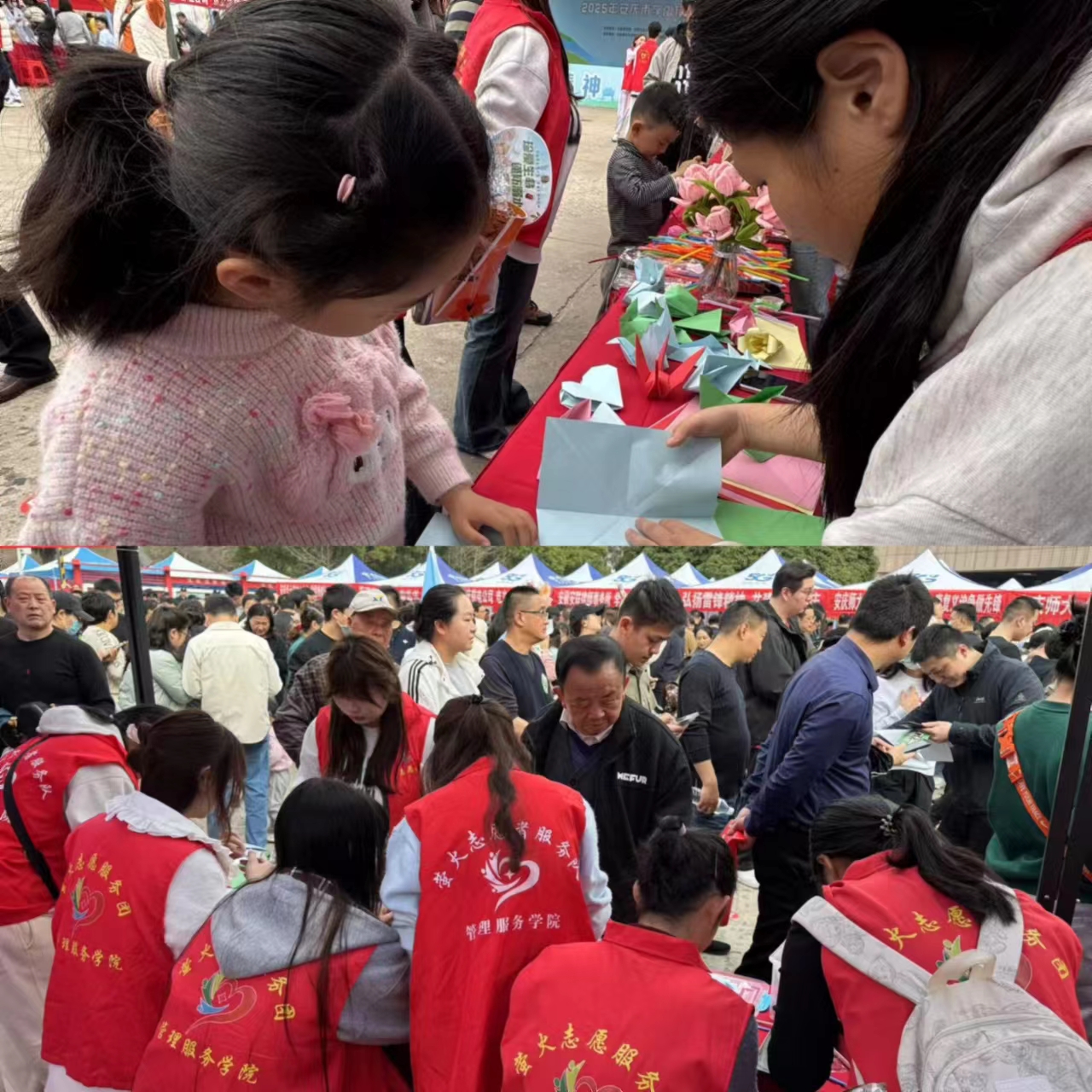 3月5日,在团市委、校团委主办的雷锋公益市集中,“萤火”志愿服务队设立了“健康驿站”与“巧手工坊”两个展位。在“健康驿站”展位,志愿者们为师生们提供免费血压测量服务,现场收集健康数据100余份;“巧手工坊”展位旁,志愿者们推出了黏土手工作品制作、剪纸技艺、非遗漆扇体验,吸引了众多家庭亲子的共同参与。