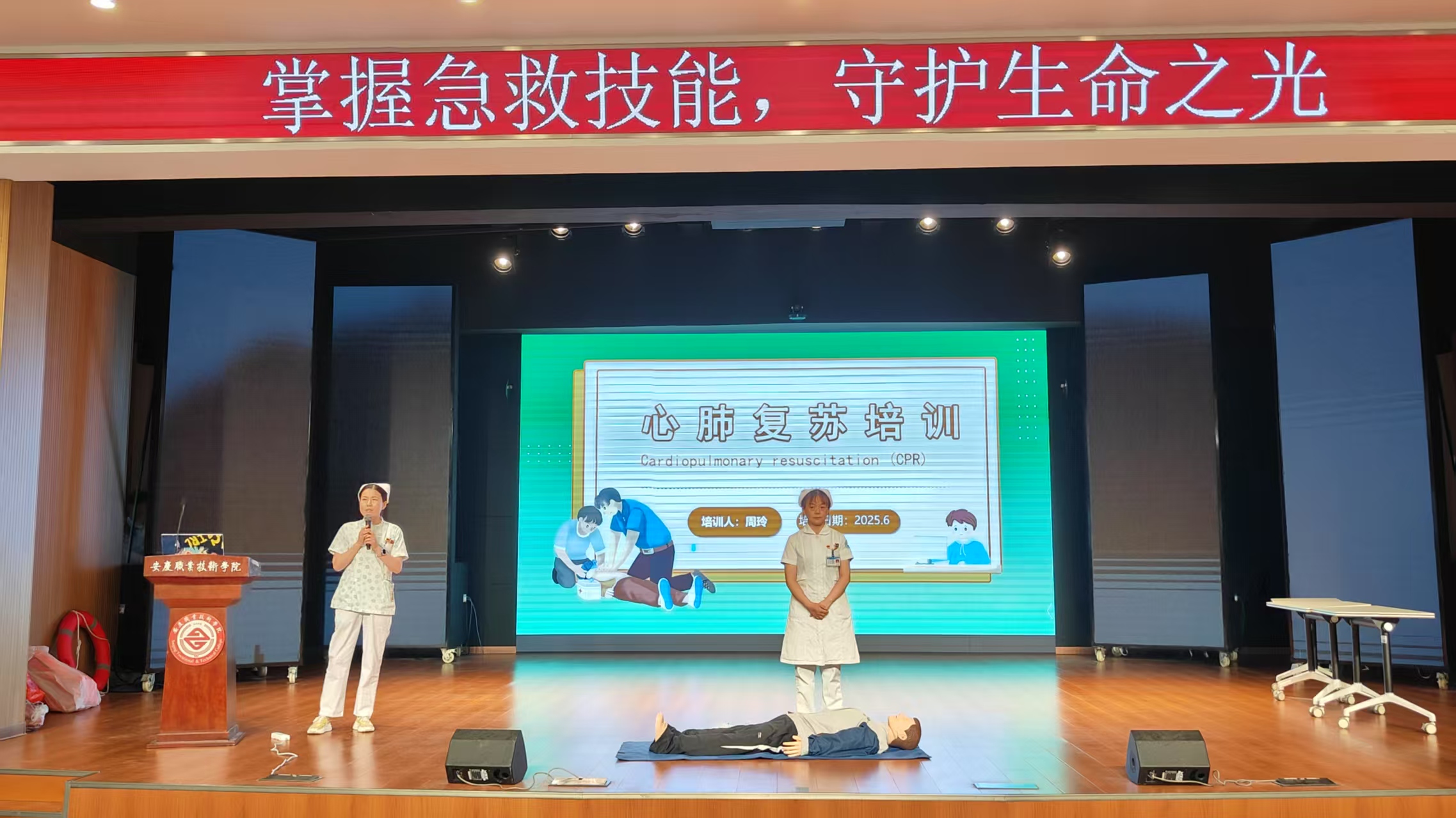 安庆市第二人民医院护士长周玲则将重点放在与时间赛跑的急救环节。她聚焦心脏骤停、气道梗阻等紧急状况,通过情景模拟强化“黄金救援时间”意识。在心肺复苏(CPR)教学中,周玲分步拆解操作要点,并利用人体模型组织师生进行轮番实操训练。“按压时手臂必须垂直用力,持续5分钟就浑身冒汗,真切体会到急救对体力的高要求!”参与练习的2024级学生蔡宇培深有感触。针对气道异物梗阻,周玲清晰演示了成人及婴儿版海姆立克急救法,并设置模拟窒息场景供师生动手操作,有效提升了危机现场的应对能力。