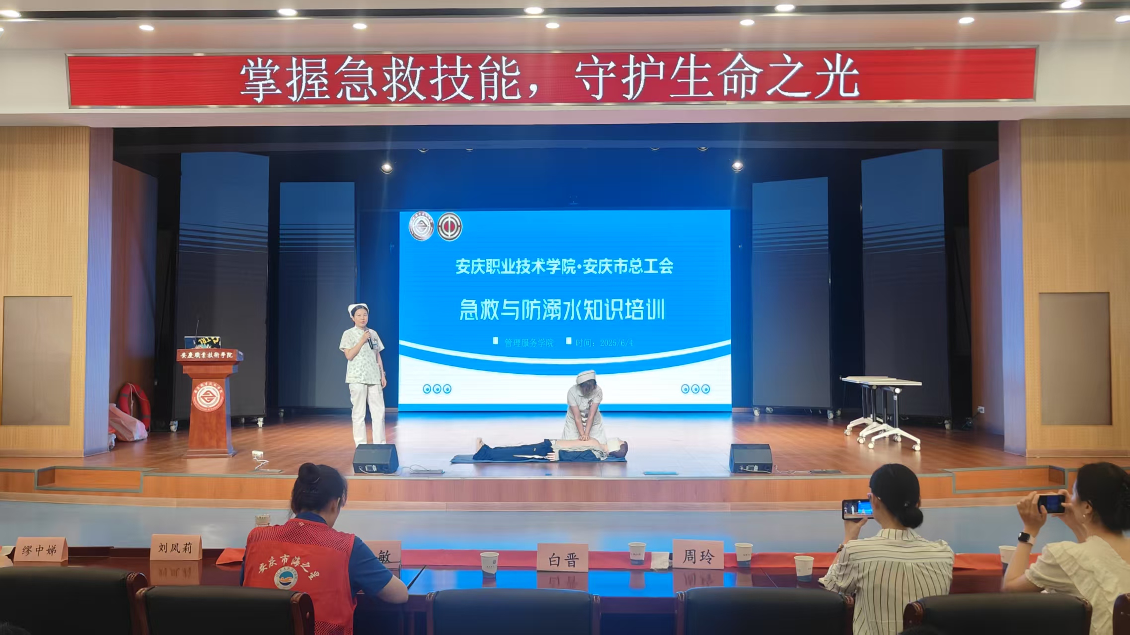 暑期将近,为增强师生安全意识,全面提升师生应急救护能力,6月4日,WilliamHill中文官方网站管理服务学院联合安庆市总工会,共同举办了一场以“防溺水与应急救护知识”为主题的专题培训。活动特邀专业师资,通过案例剖析、技能演示与沉浸式实操演练,为师生送上实用的生命守护技能,有效提升应对突发事件的应急处置能力。安庆市总工会职工学校副校长白晋、校继续教育学院院长姚咏、管理服务学院学生工作负责同志、专兼职辅导员老师与160余名在校学生参加培训。