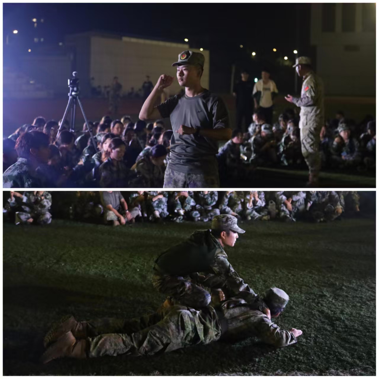 连队才艺展示环节精彩纷呈,尽显高职学子的多元风采。最引人注目的是连长擒拿格斗展示,军事教官出身的连长们动作迅猛、招式精准,刚劲有力的表演赢得新生阵阵喝彩,生动诠释了“过硬连队”的纪律与力量。压轴登场的营长歌曲独唱《我们的时光》,浑厚嗓音与师生跟唱交织,温暖歌声回顾军训点滴,为新生们的青春时光送上美好寄语,引发全场共鸣。