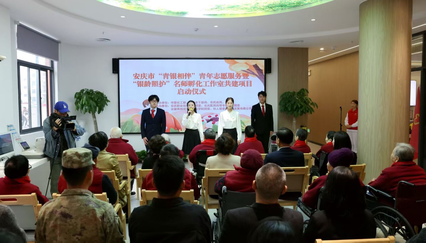 10月26日上午,安庆市“青银相伴”青年志愿服务暨“银龄照护”名师孵化工作室共建项目启动仪式在怡人堂晶海养老服务中心顺利举行。市人大常委会副主任叶林霞出席仪式,市委社会工作部、市委老干部局、市民政局、团市委主要负责同志,校党委委员、统战部长李五一等参加了活动。