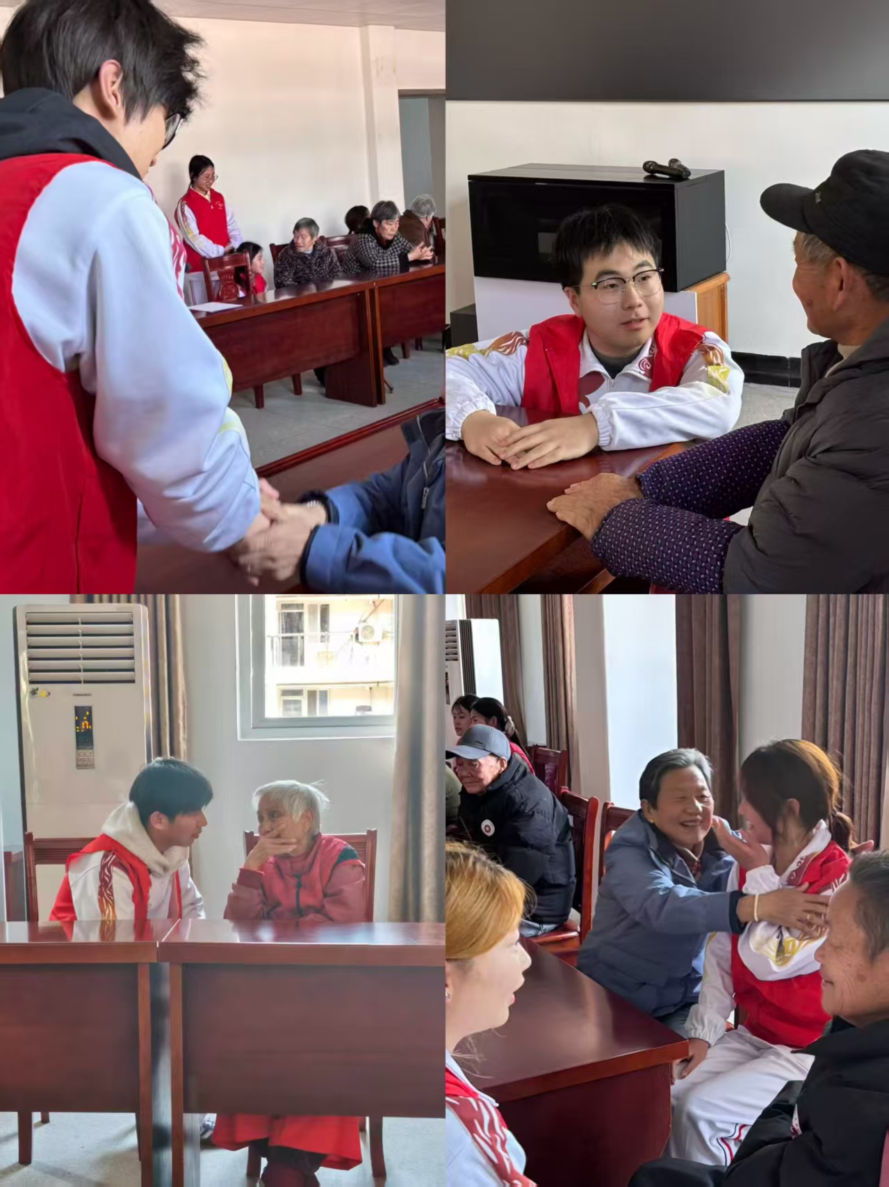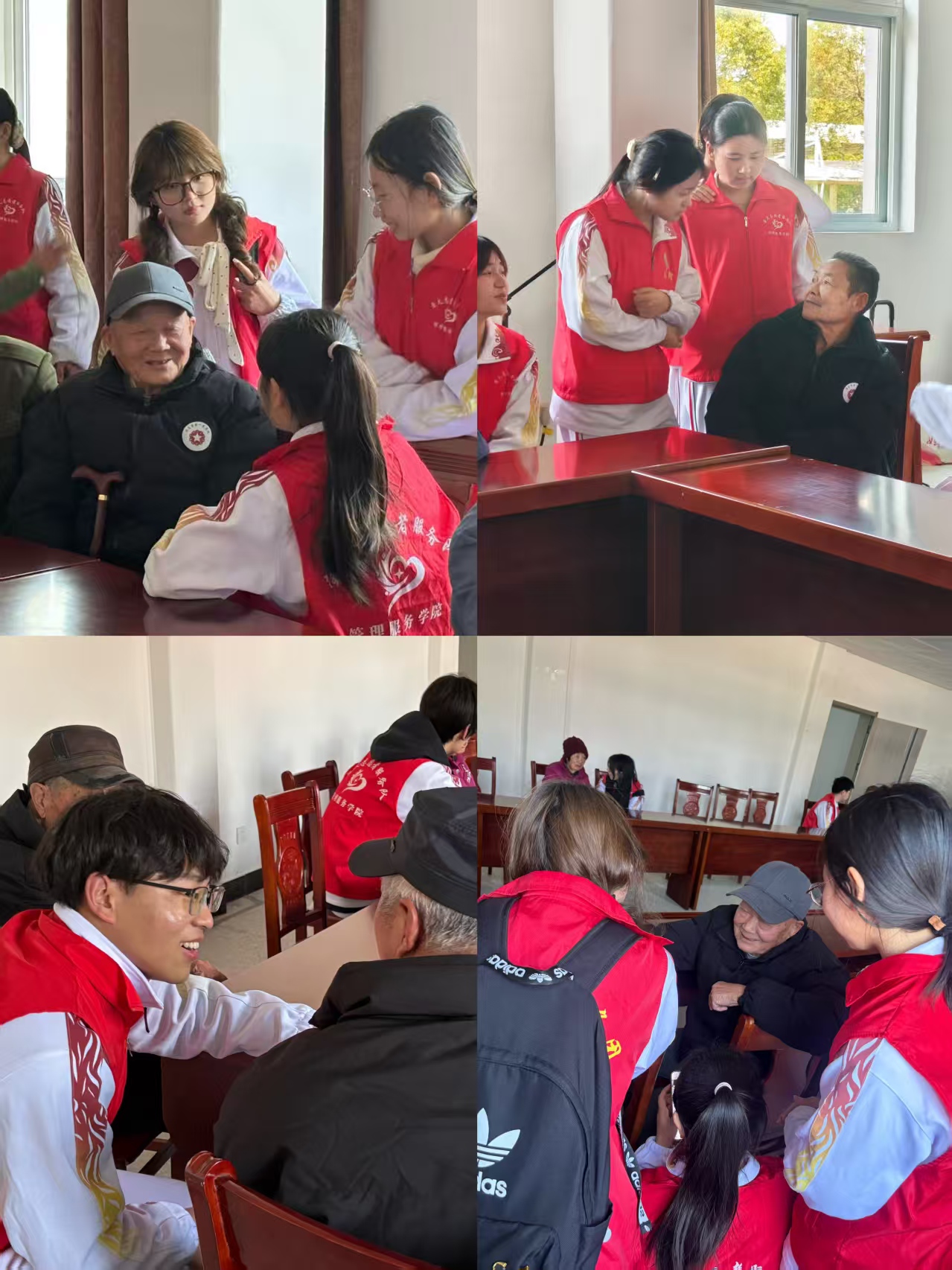 在“青银相伴”志愿服务环节,学子们围坐在老兵身边促膝长谈,以青春温度温暖银发岁月。老人们兴致勃勃讲起当年的军旅故事,学子们用心聆听,在红色故事浸润中接受深刻思想洗礼。一句句贴心问候、一次次真诚交流,让光荣院洋溢着温馨和谐的氛围,“青银相伴”拉近了两代人距离,让尊老爱老美德在互动中传承。