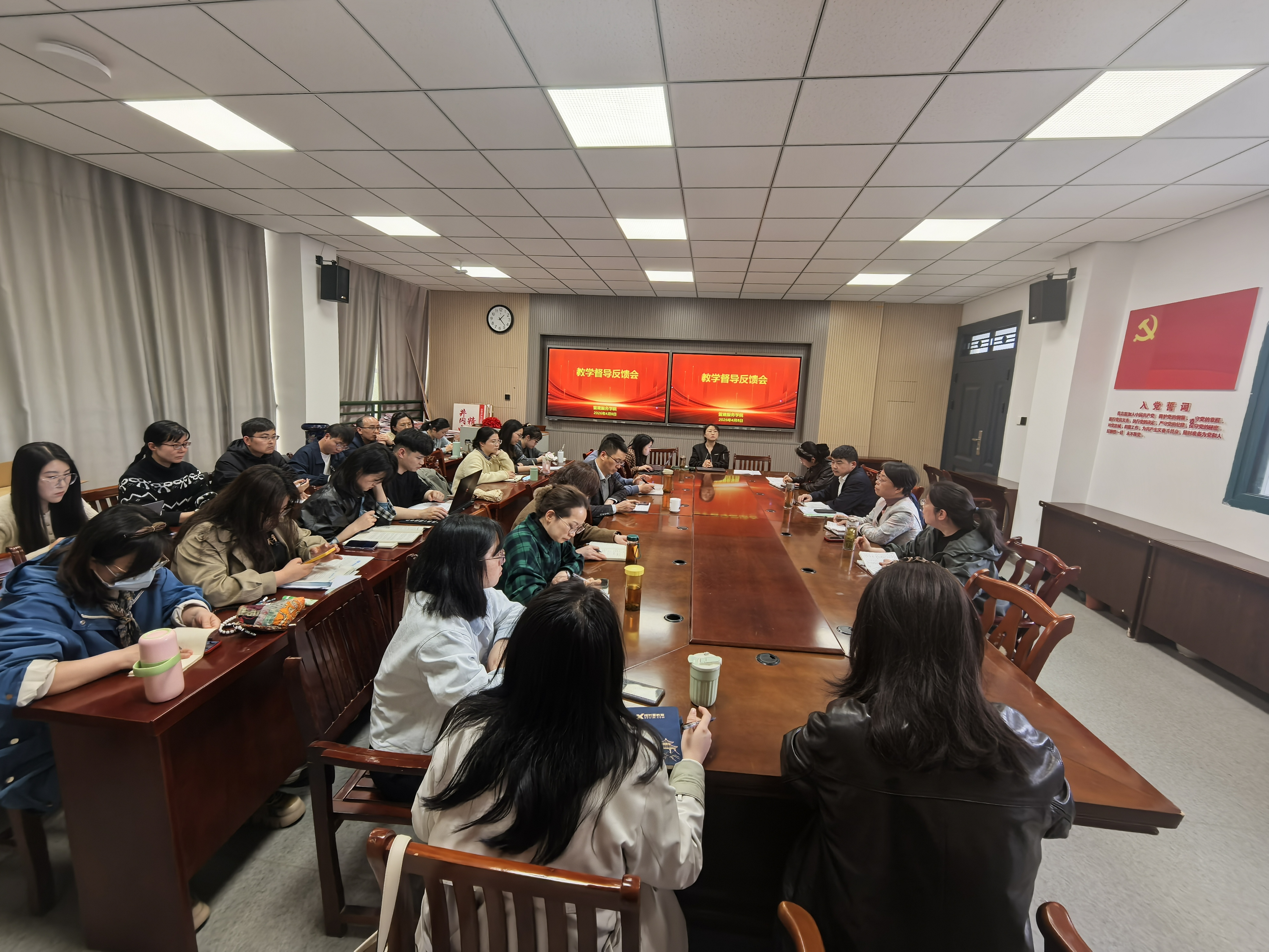 4月8日,管理服务学院在3号教学楼314会议室召开教学督导反馈会,邀请教学督导朱宜娟副教授、郭媛媛教授、黄先军副教授到会指导,学院全体教师参会。