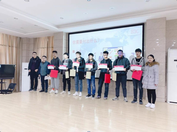 12月4日下午,在第二教学楼,电子系陈富汉老师、甘晨老师及新华三安徽培训中心(云宝集团)王彪经理共同为获奖同学颁发了新华三荣誉证书及奖品,祝贺同学们在比赛中取得优异成绩。(审核:胡章云)