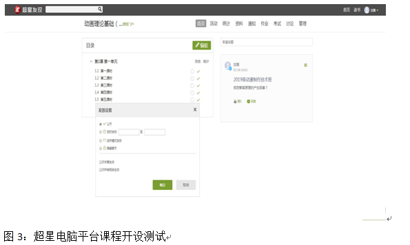 与此同时,除了理论课程的照常开展,在理实一体、实验实践课程的教学必要时期,动漫专业教师讨论选择并学习使用学院超星“一平三端智慧教学系统”在线教学服务平台,包括利用速课(微视频)及超星资源在线课程的使用。利用手机同步平台的“学习通”超星直播近距离加强与学生的紧密联系,做到时教时播随时问答的学习氛围,真正完成停课不停学、学生真正参与和感兴趣的创意学习目标。