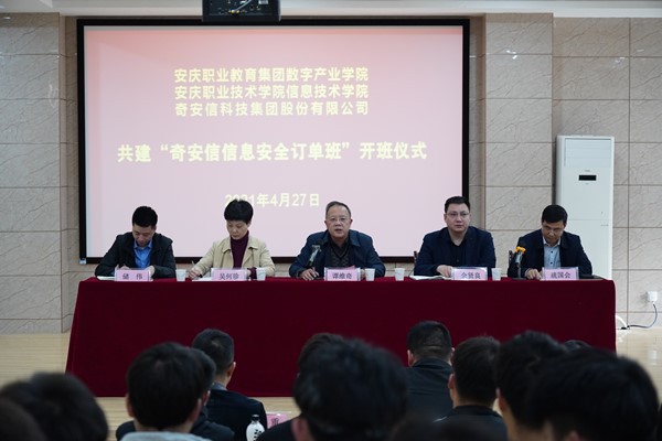 4月27日下午,由安庆职教集团数字产业学院、WilliamHill中文官方网站信息技术学院与奇安信科技集团股份有限公司合作共建的数字产业学院首届“奇安信信息安全订单班”开班典礼在2号教学楼216教室隆重举行。