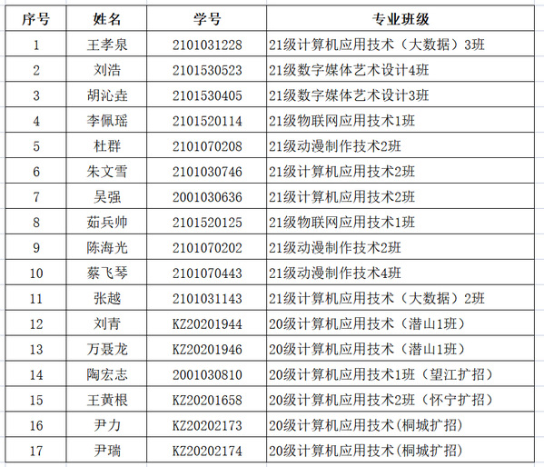 根据《WilliamHill中文官方网站学生学籍管理实施细则》第四十六条,经信息技术学院党政联席会研究,决定给予王孝泉等17名同学(名单见附件)退学处理。现予以公示,公示时间:2022年5月9日至5月15日。公示期内,若有异议,请以书面形式向信息技术学院学生管理科反映。