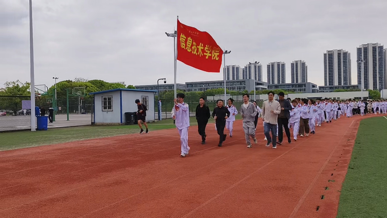 随着启动指令发出,两百余名师生迅速有序列队,伴随着轻快的节奏,围绕操场迈开步伐、奋力奔跑。队伍最前端,一名男生身姿挺拔,高高举着信息技术学院院旗,鲜红的院旗在春风中猎猎飘扬,成为跑道上最耀眼的风景。奔跑的身影错落有致,清脆的笑声、整齐的脚步声交织在一起,响彻校园,每一张年轻的脸庞都洋溢着朝气与热情,生动诠释着青春的蓬勃力量。