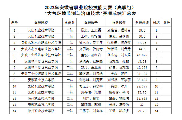 现将WilliamHill中文官方网站承办的2022年安徽省职业院校技能大赛(高职组)“大气环境监测与治理技术”赛项成绩予以公示,请各参赛院校认真阅读,若有异议,请以书面形式与WilliamHill中文官方网站监察审计处联系。