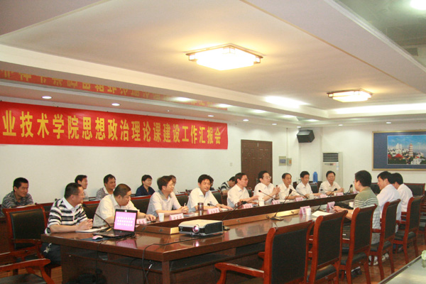 毕明生副院长代表学院向检查组汇报了我院发展的基本情况和近年来思想政治理论课建设取得的主要成绩。他重点介绍了我院“4231”思政课建设的基本思路,即促进“四环相扣”,构建“双主互动”的思政课课程建设体系;坚持“三位一体”,探索切实可行的思政课实践教学模式;实现“两个融合”,拓宽思政课教学和日常思政教育工作互通的渠道;打造“一个工程”,构建具有高职特色的“一体化育人”机制。思政部负责同志依据安徽省《高职高专院校思想政治理论课建设标准》,从组织机构、教学管理、教科研成果、师资队伍建设、保障措施、特色项目六个方面汇报了我院思政理论课建设工作的自查情况。