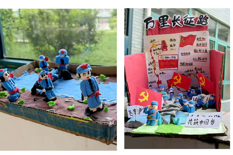 泥塑作品以精湛工艺再现长征壮举,蓝灰军装的红军队伍蜿蜒行进,他们或扛枪前行,或相互搀扶,展现了长征途中的艰辛与团结。红旗招展,生动塑造了飞夺泸定桥等长征途中的关键场景,红军战士们或攀爬铁索,或奋勇冲锋,人物群像栩栩如生,展现了红军不畏艰难、勇往直前的革命精神。任课教师韩蕾说到,长征精神从不是教科书上的铅字,而是可以用温度感知的生命记忆,这些浸润着信仰的泥塑作品,应成为我们人生路上的精神火种。