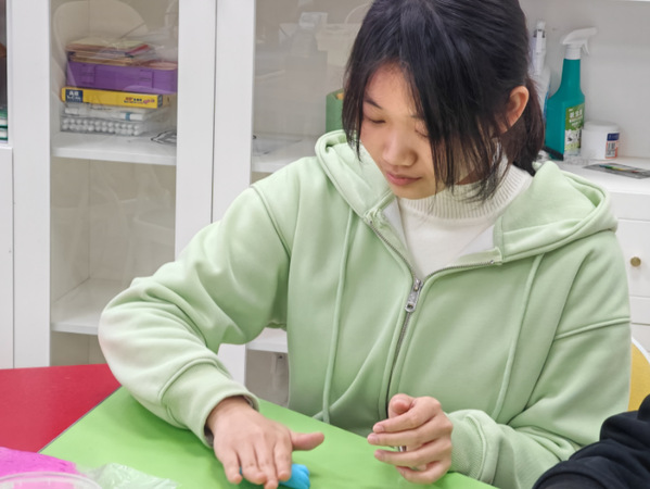 活动现场,圆桌被各色黏土铺满——嫩绿、粉樱、鹅黄交织在一起,宛如打翻了一盒春日调色盘。没有固定的模板,也没有标准的答案,每位同学都按照自己心中春天的样子去揉、搓、捏、塑。有的同学捏出了绽放的花朵,有的同学塑造了可爱的小动物,还有的同学用抽象的色彩表达春风拂面的感觉。大家纷纷表示,正是在这种自由表达的过程中,他们体验到了久违的专注与平静。