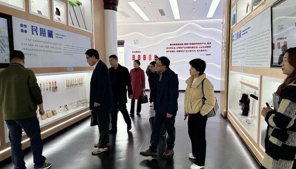 在安徽省刷业商会秘书长丁跃进的陪同下,金启胜一行参观了刷业小镇客厅和“两把刷子”众创空间。丁跃进详细介绍了产业园“一园两仓两平台”(产业园、保税仓与海外仓、刷博会平台及联合刷网平台)的运营模式。目前,源潭刷业产值逾百亿元,规模居全国首位,获评“中国刷业之都”称号。源潭镇还拥有全国唯一的省级刷制品质量监督检验研发中心、全省唯一设于乡镇的“安徽省刷业商会”、全省首个乡镇级保税仓库及跨境电商产业园,为入驻企业提供跨境电商全链条服务,涵盖品牌孵化、物流配送、政策申报及国际营销等环节。