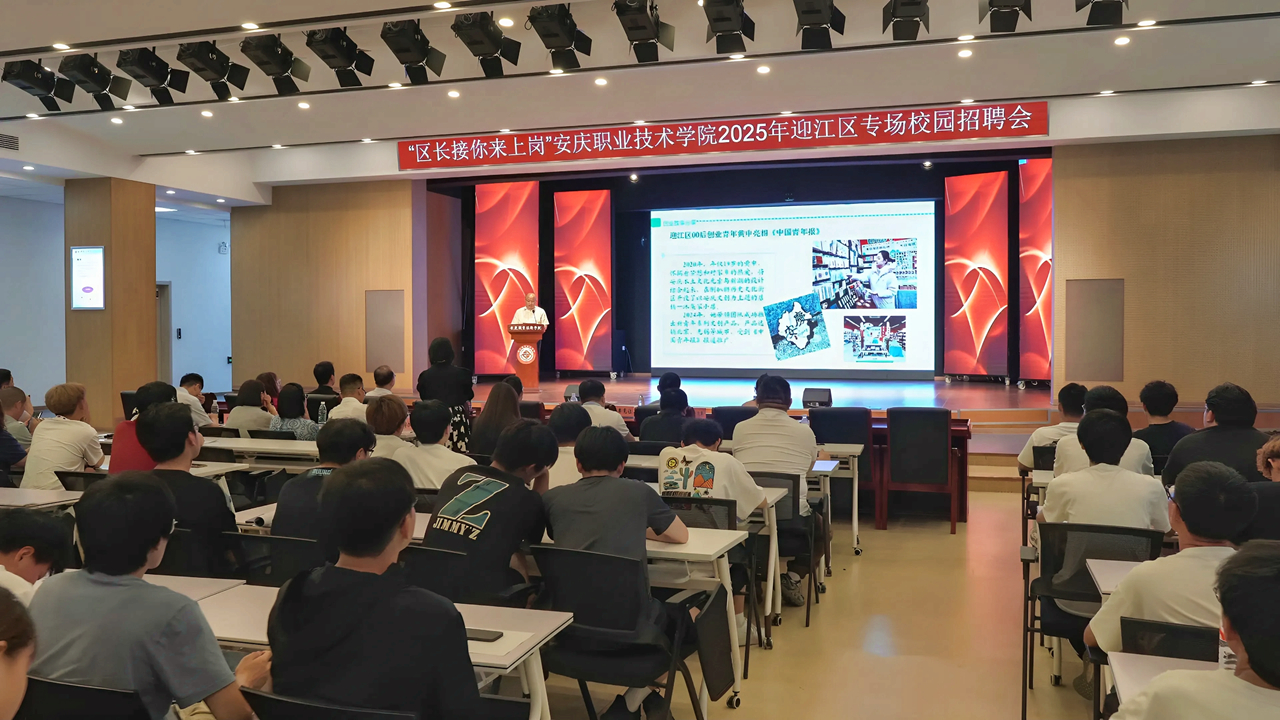 谢长兵代表迎江区向在场师生做了充满激情的创业就业推介。他以“这里是迎江”“欢迎来迎江”两个篇章,全面展示了迎江区的综合实力、产业活力与城市魅力。他强调,迎江比以往更渴求、更能成就人才,将以最优的服务、最好的环境,诚邀广大学子选择迎江、扎根迎江,在智能制造、文旅融合等领域释放青春动能。