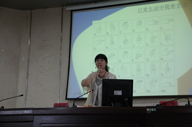 培训会上,陈新民教授以残疾人体育运动发展概况为开篇,讲述了残疾分类和不同残疾类别的运动会及残疾人运动会志愿者工作的主要内容和服务技巧,强调了运动员安全和自身安全的重要性,提出志愿者与运动员相互学习、影响达到双赢的效果。曹灿老师介绍了聋生的心理特征及简单的日常手语表达,上课过程中曹老师与志愿者们进行了互动,形象生动的教授基本的日常手语表达,使志愿者们积极踊跃的参与其中。段蓓蓓老师做最后总结,通过介绍残疾人的心理特点和与他们沟通的技巧、基本礼仪来结束本次长达4个小时的培训课程。