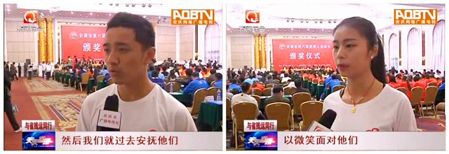 志愿者高飞负责聋人篮球,“因为跟他们语言不通,有的时候他们要水的话跟我们说,比划的话就好费事,后来我们志愿者主动把水放在他们面前,他们拿的话(方便),第一天去的时候不知道,第二天的时候我们就带笔带纸,然后写给他们看。”“因为他们是残疾人,可能比我们正常人更注重那些荣誉,因为他们有的时候比赛输的话,在地上特别懊恼的捶地板,然后我们就过去安抚他们。”……