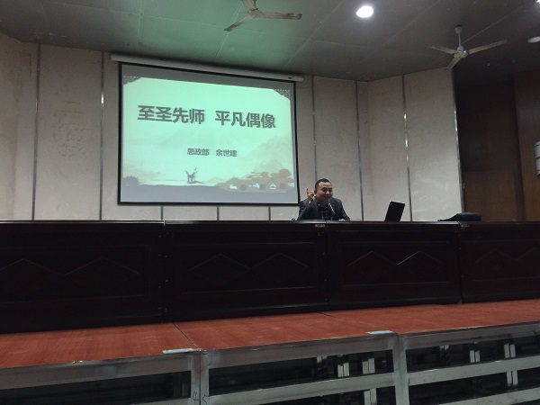 4月27日晚,科学人文艺术素质系列讲座 “至圣先师,平凡偶像”专题在我院图文信息中心一楼报告厅举行。本次讲座邀请思政部教师余世建主讲,全院600余名同学聆听了讲座。