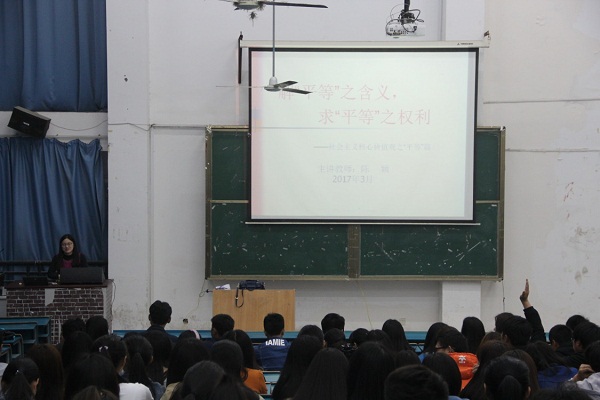 4月25日晚,科学人文艺术素质讲座“解‘平等’之含义,求‘平等’之权利”专题在1#316教室开讲。讲座由陈颖老师主讲,来自各系150余名学生干部代表聆听了讲座。