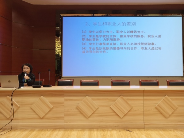 讲座围绕“做好学生到职场人的过渡”、“职业意识培养”、“职场中需要注意的问题”三个方面,详细阐述了大学生就业过程中所面对的问题;重点从如何展示个性、职场礼仪、遵守规章制度、公司潜规则等方面入手讲解职场问题;讲座中朱宜娟还介绍《劳动合同法》,辅以大量真实案例深入浅出地向同学们传授如何维护自身合法的权益;最后她提醒同学们签订合同需要注意的事项及受到侵权时使用法律的重要性。