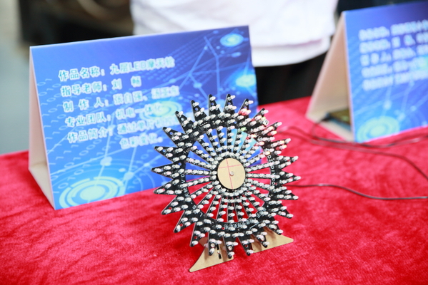 本次科技创新作品展分献礼百年红色主题展、科技创新创意作品展、“互联网+”创新创业作品展和环保创意作品展四大展区。献礼百年红色主题展主要利用3D打印技术制作模具成型,“三羊开泰”、“福星高照”等10件优秀作品集中亮相,生动诠释了思想性与艺术性的相统一,表达了师生对党和国家的挚爱深情。科技创新创意作品展分多轴动态加工作品展示和电器控制、数控加工科技作品展示两大板块,“三坐标机器人”、“基于无线WIFI控制的智能小车”、“四足机器人”、“炫彩小蛮腰”等富有创意作品吸引现场师生驻足欣赏。“互联网+”创新创业作品展是将我院“互联网+”创新创业作品通过展板和现场项目讲解的方式集中展示,现场项目负责人向现场师生做项目讲解,突出展现了我院在“互联网+”创新创业竞赛方面的优异成果。学生们利用废旧纸盒、易拉罐等创新制作的“无接触式感应垃圾桶”、“自制饮水机”、“雾化机”等也让现场师生眼前一亮。