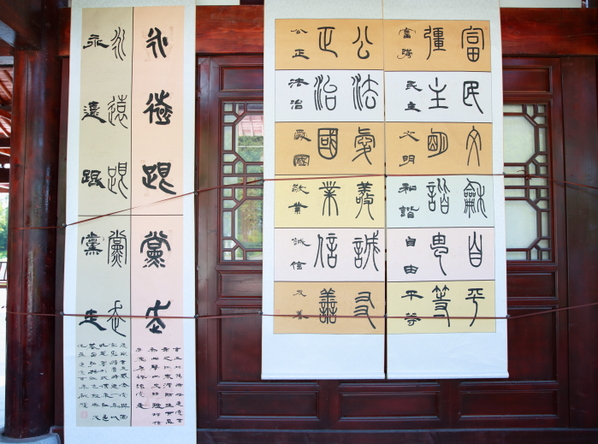 6月22日,“永远听党话·永远跟党走”庆祝建党百年传承中华经典书画作品展在学校水榭长廊举行。校党委宣传部、校团委、公共基础部、现代商务学院、语委办遴选出百幅优秀书画作品。此次活动由特色学生社团逸风书法社具体承办,参展作品以书法作品为主,体兼篆隶楷草行,韵步汉唐魏晋风。步入展厅,“永远跟党走”“四个自信”“社会主义核心价值观”及红色革命诗文等主题内容十分醒目,充分展现了广大师生的爱党爱国之心和对优秀传统文化的热爱之情。轩窗廊榭古朴雅致,莲叶菡萏清香盈怀,将红色主题和喜庆氛围衬托得鲜明浓厚;信念美、人文美、景观美、自然美统一和谐,相映成趣,吸引了一批又一批师生驻足观赏。