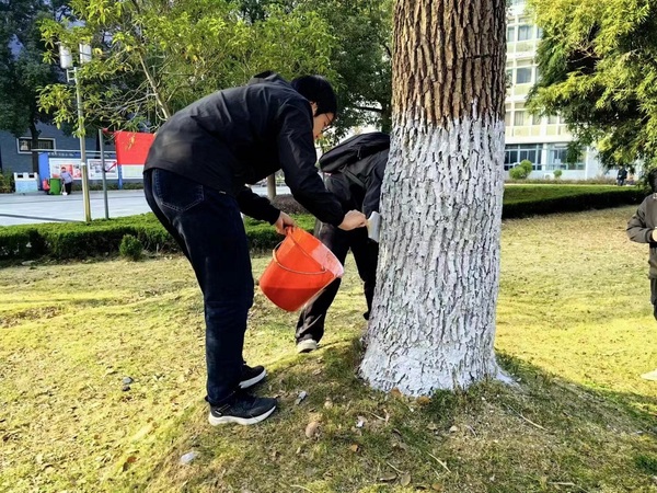 校后勤处余碧霞老师向参与活动的学生们讲解冬日护绿的理论知识,介绍树木刷白具有杀菌消毒、保温防冻、防治病虫害的作用,并指导学生具体操作方法。然后组织学生进入实践环节,同学们三人一组,从2号教学楼东门口依次排开,快速地投入到树木刷白的活动中。同学们认真地将混有石灰等材质的涂料覆满树干,高涨的劳动热情给冷冽的冬天平添了一抹暖色。