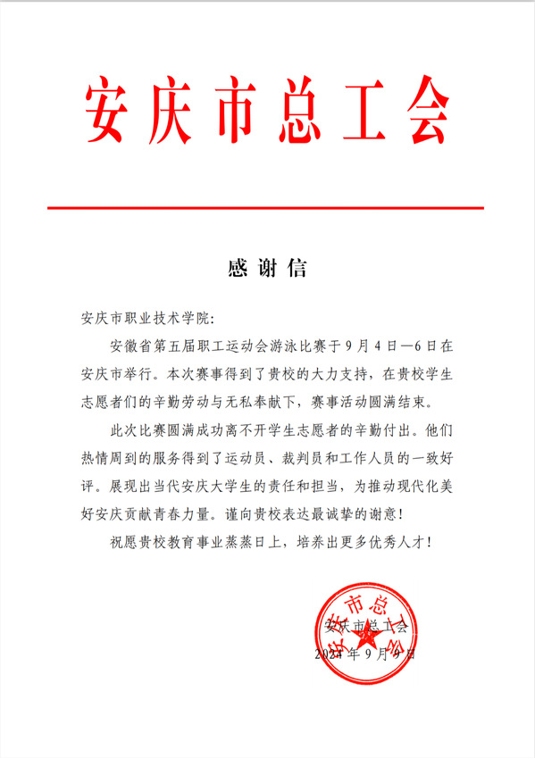 WilliamHill官网34名学生志愿者收到来自安徽省第五届职工运动会组委会和安庆市总工会的感谢信