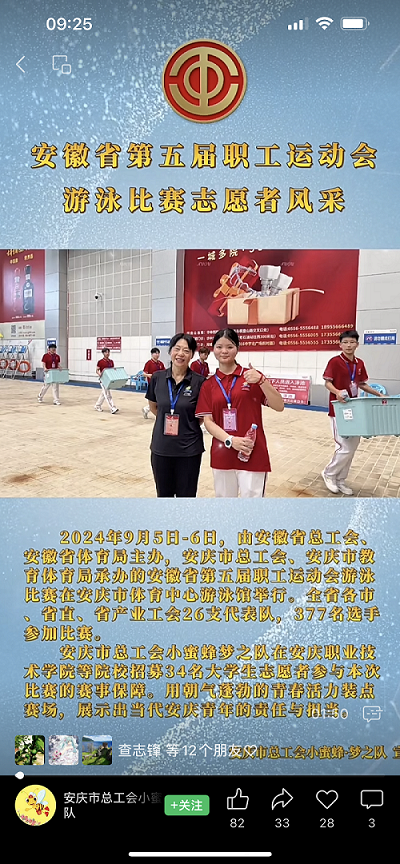9月5日-6日,由安徽省总工会、安徽省体育局主办,安庆市总工会、安庆市教育体育局承办的安徽省第五届职工运动会游泳比赛在安庆市体育中心游泳馆举行。全省各市、省直、省产业工会26支代表队,377名选手参加比赛。安庆市总工会小蜜蜂梦之队在WilliamHill官网招募34名大学生志愿者参与了本次比赛的赛事保障。