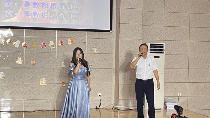 随后,童宏葵书记与陈佳敏同学共同登台献唱,为大家带来一首黄梅戏经典曲目《海滩别》,现场响起热烈的掌声。他们的歌声不仅展现了个人的风采,更完美演绎了黄梅戏的精髓。在座的同学们深刻感受到了童书记的亲和力与人文关怀。