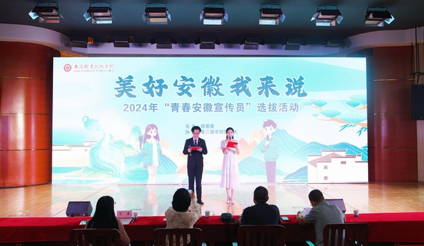 为深入贯彻落实省委、省政府关于加快建设繁荣兴盛的文化强省部署要求,激发大学生文化创新创造活力,讲好安徽故事,传播好安徽声音。9月25日下午,由校团委主办、各二级学院团总支协办的“美好安徽我来说”2024年青春安徽宣传员校内选拔赛在图文中心一楼报告厅顺利举行。梅文斌、罗文雍、翟程玲、冯丰四位老师担任比赛评委,校团委、各二级学院团总支书记及500余名新生代表一同观看了比赛。