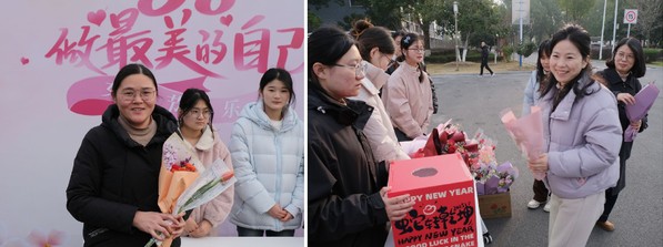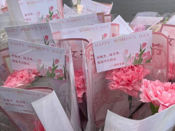 活动当日,校学生会同学早早地来到校门口,将一枝枝精心包装的花朵整齐排列,每枝鲜花都附有定制的祝福卡片——“育桃李,绽芳华,祝您节日快乐。”女教职工走下班车后,鲜花与真诚话语一同送到她们手中,收到鲜花的她们满是惊喜。花香点亮了她们的眼眸,笑语萦绕在她们耳旁,现场充满融融暖意,同学们的柔语欢颂与老师们的欣慰笑容交织,勾勒出校园最美的春日画卷。