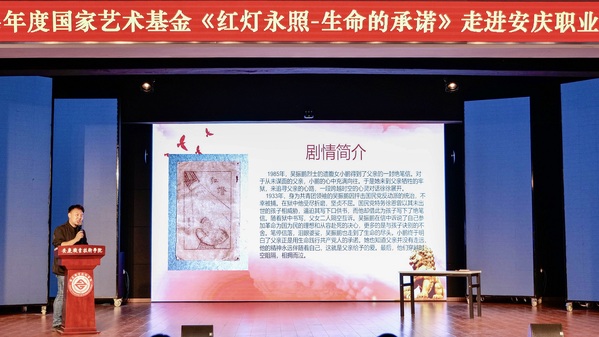 该剧目是由安徽黄梅戏艺术职业学院师生创作演绎,先后入选2024年国家艺术基金舞台艺术资助项目,参加2024年中国(安庆)黄梅戏艺术节剧目展演。正式演出前,安徽黄梅戏艺术职业学院学术委员会常务副主任、一级导演胡继宗老师,深情讲述了剧目的创作背景和故事概要,创作团队以安庆本土革命烈士吴振鹏为原型,将革命烈士的英雄事迹融入传统文化黄梅戏,带领我们近距离了解安庆籍革命烈士吴振鹏的革命故事。