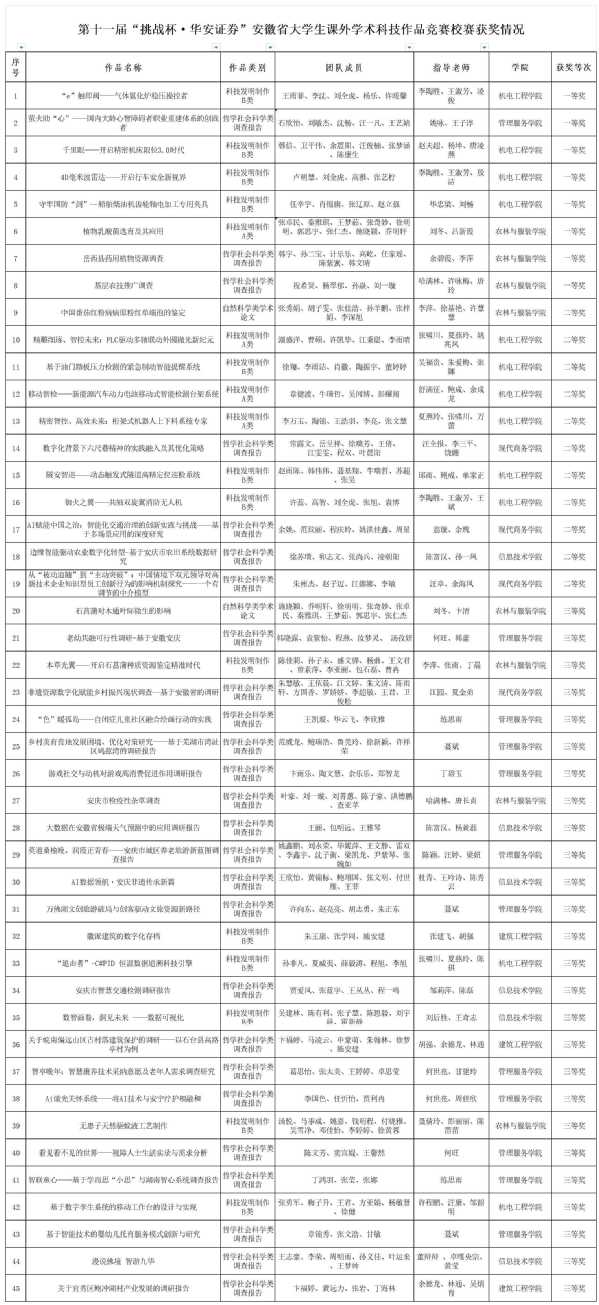 关于第十一届“挑战杯·华安证券”安徽省大学生课外学术科技作品竞赛校赛获奖情况的公示