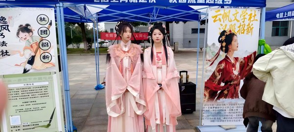 活动现场气氛热烈,各社团纷纷亮出“看家本领”,展现社团风采。青年志愿者协会的工作人员则耐心细致,面对新生的咨询,逐一讲解志愿活动的内容、时间安排及参与意义,传递“奉献、友爱、互助、进步”的志愿精神;棋类爱好者协会新老社员两两对坐,凝神思考、落子从容。一旁围观的同学屏息观战,每当出现精彩的对弈瞬间,现场便响起阵阵赞叹;云帆文学社的志愿者们穿着精美的汉服,与新生携手,共赏汉服之美、遥寄五千年风雅情怀;吉他协会成员们抱着吉他坐在帐篷前,指尖拨动琴弦,一首首耳熟能详的歌曲缓缓流淌。从轻快的流行曲到治愈的民谣,动人的旋律吸引了大批同学驻足;漫无极协会的coser们主动走向同学,用角色专属的问候语开启互动,引得现场掌声不断。