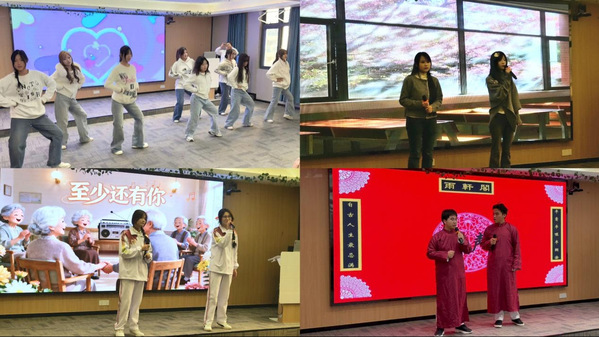 带着青春的朝气与温暖的陪伴,同学们精心准备的文艺节目率先登场:一段经典戏曲《黄梅戏》赢得了满堂掌声;雨轩阁相声社的《说学逗唱》逗得爷爷奶奶们开怀大笑;而舞蹈爱好者协会的《苏公堤》则以柔美舞姿,将大家带入如诗如画的江南水乡,陶醉其中。最终,演出在深情的歌曲《至少还有你》中圆满落幕。