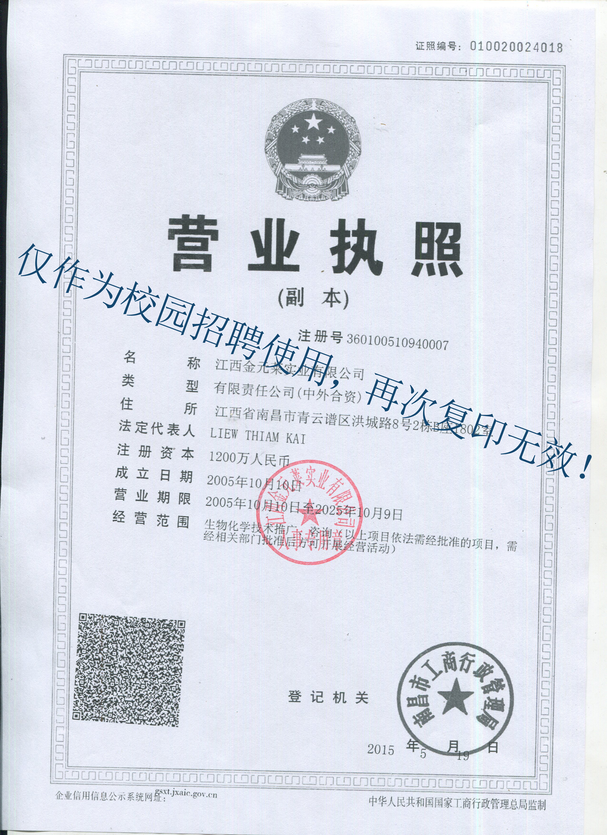 江西金元莱实业有限公司是一家集农药原药、农药制剂、化工新材料为一体的现代化集团公司。主要从事农用化工产品的研究开发和生产经营,下辖甘肃张掖市大弓农化、内蒙古祁泰化学、江西巴菲特化工、江西威力特生物科技、江西金元莱高新材料、九江菲蓝高新材料、江西康普特作物科学等十五家子公司。公司从2005年发展至今,已成为江西农化行业的骨干企业,公司总部设在江西南昌,生产基地分别位于南昌安义、九江星火、九江湖口、甘肃张掖、内蒙古阿拉善盟等多地。