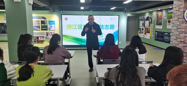 迎江区营养学会秘书长兼迎江春雨科技志愿服务队队长汪祝华向同学们介绍了春雨科技志愿服务队成立现状以及开展的志愿项目,重点介绍了健康校园行动、科普惠民进村居活动和科普馆运营活动,通过培训,同学们对自己将要参加的志愿服务活动的服务对象,服务内容,以及参加志愿活动的意义等有了初步的了解。