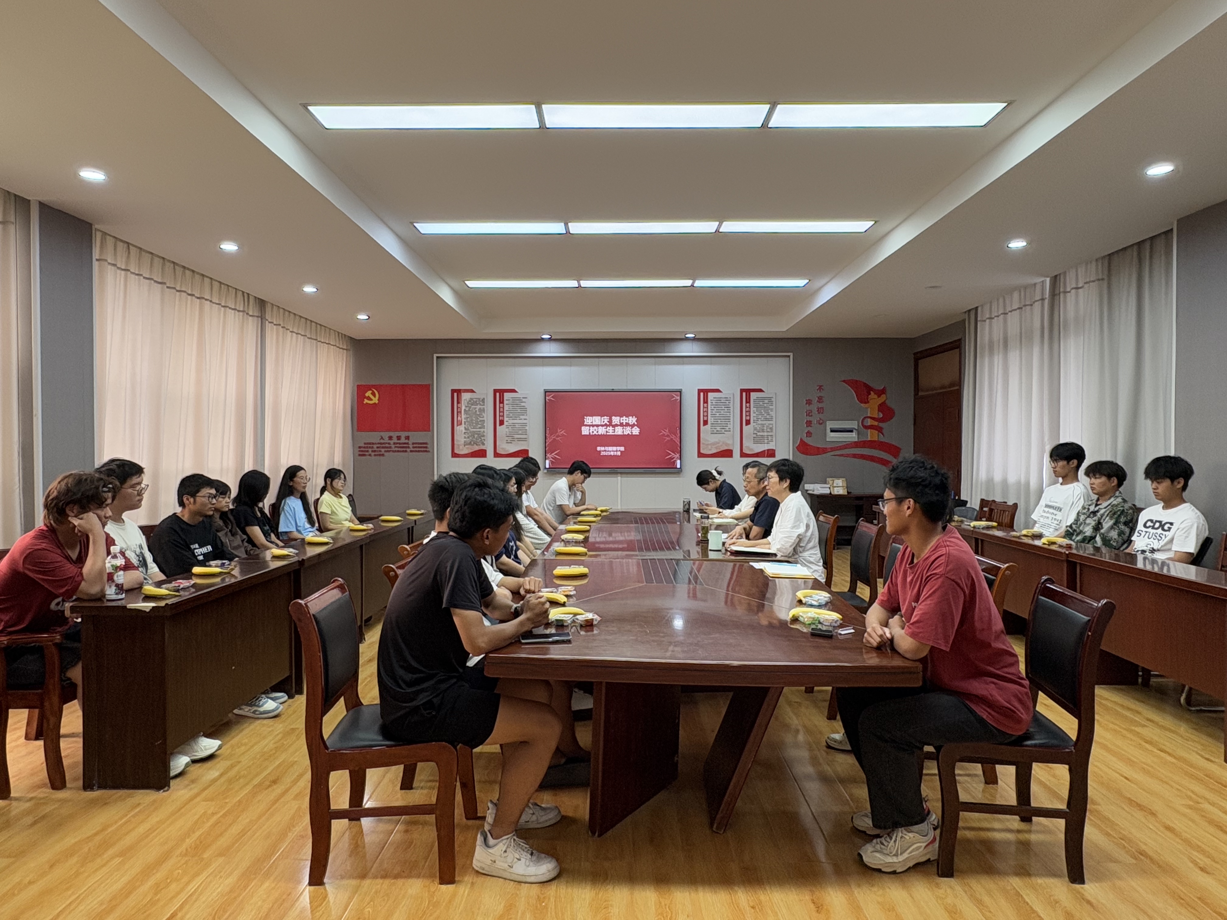 国庆又逢中秋,为切实保障留校学生的安全,了解学生需求,传递学院关怀,9月30日,农林与服装学院在会议室召开“迎国庆 贺中秋”25级留校学生座谈会。学院党总支书记李进恩、学生工作负责人、新生辅导员以及2025级留校学生齐聚一堂,共话佳节,畅想未来。