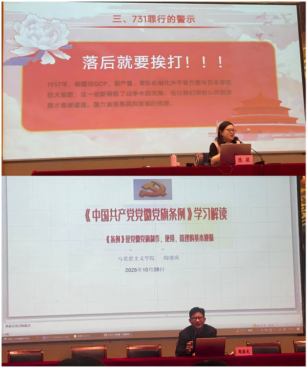 管理服务学院党总支书记、院长陈颖以《从731罪行中汲取力量 新时代大学生党员的责任与担当》为题,通过珍贵史料与历史影像,带领学员回顾民族伤痛,深刻领悟“落后就要挨打”的历史警示。课程激励大家以史为鉴,将历史感悟转化为践行初心使命的强大动力,在新时代扛起青年一代的历史责任。